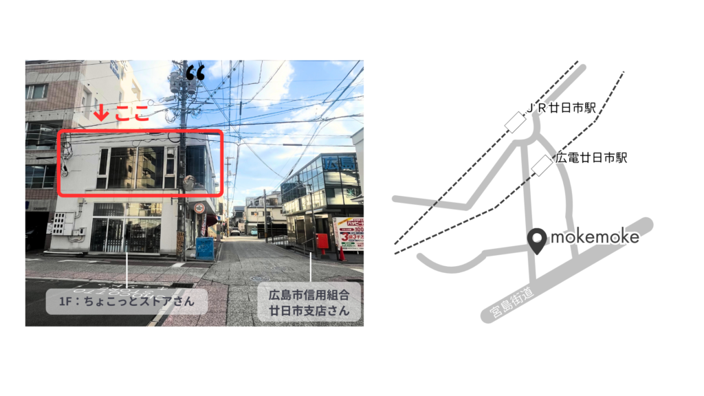 JR廿日市駅/広電廿日市駅近くの「けん玉商店街」にあるビルの2階になります。